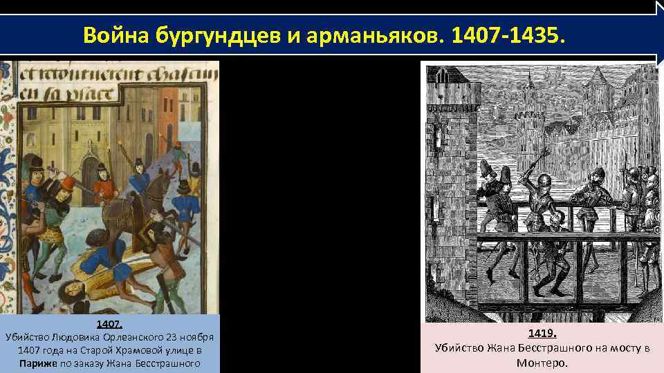 Убийство Жана Бесстрашного вызвало новый виток кровопролитий и междоусобных войн. Противостояние арманьяков и бургиньонов (всё те же партии орлеанцев и бургундцев) сделало улицы Парижа страшными. Арманьяки привели на помощь гасконские банды. Не лучше были и жестокие кровавые бургиньоны, поддерживающие иноземцев – англичан. На страницах книги воссоздана мрачная атмосфера мстительности тех времён.