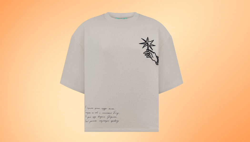 Футболка с цитатой «Я научилась просто, мудро жить, Смотреть на небо и молиться Богу, И долго перед вечером бродить, Чтоб утомить ненужную тревогу», дополненная абрисом руки, держащей звезду.