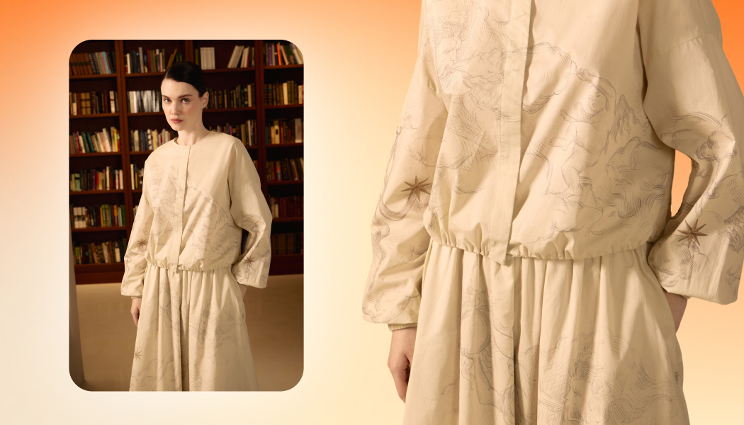 Визуальный язык капсулы строится на авторских иллюстрациях, созданных художниками DREAMS by Alena Akhmadullina. Один из ключевых собирательных образов поэзии и вдохновения раскрывается в комплекте юбки и бомбера с крупным принтом.