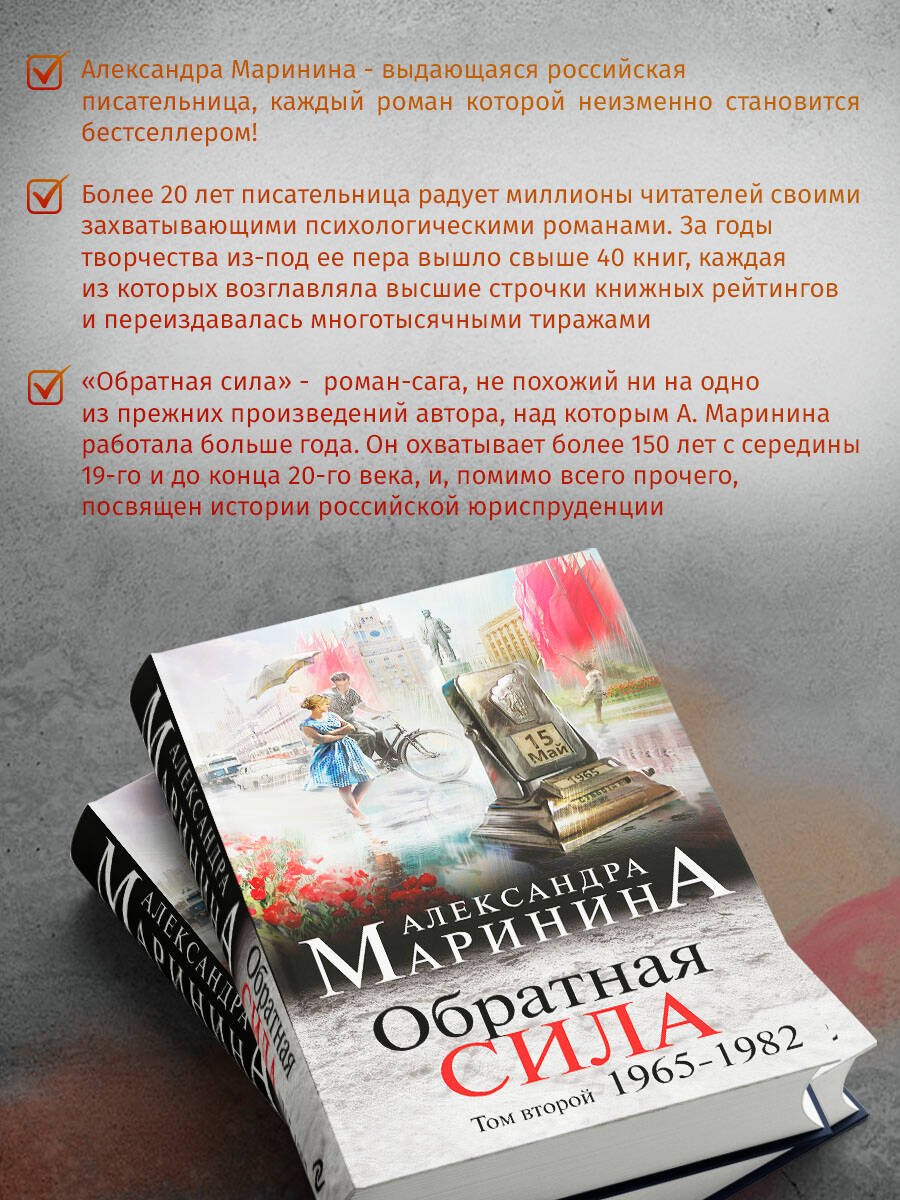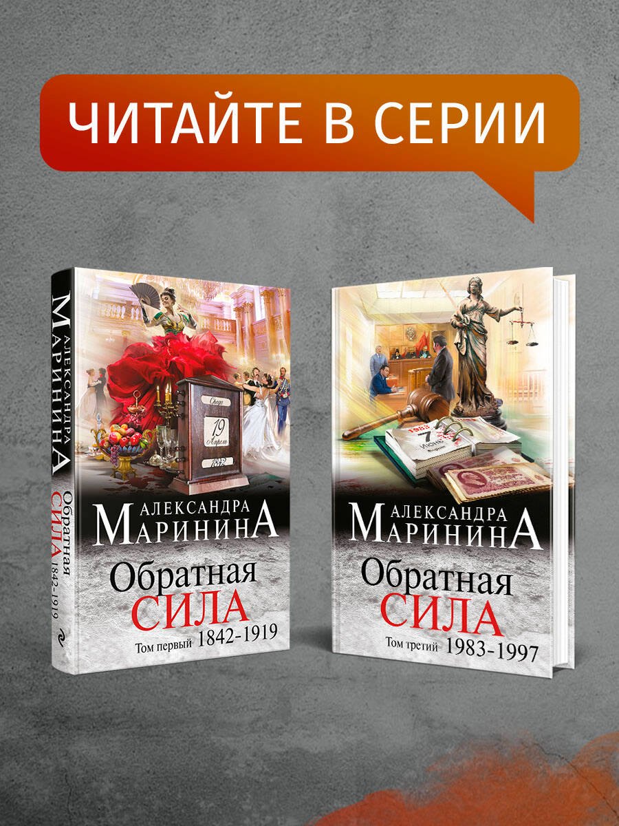 О книге: Роман Александры Марининой «Обратная сила» – это история одной семьи, нескольких поколений юристов, начиная с 1842 года и до наших дней. Их не только объединяют сложные родственные отношения, но и связывают узы любви, совести, долга и чести. Все события разворачиваются на фоне значимых исторических реалий: реформ Александра II, антисемитизма Александра III, отречения царя, Великой Октябрьской революции, Гражданской войны, репрессий, Великой Отечественной войны, хрущевской оттепели и т.д.