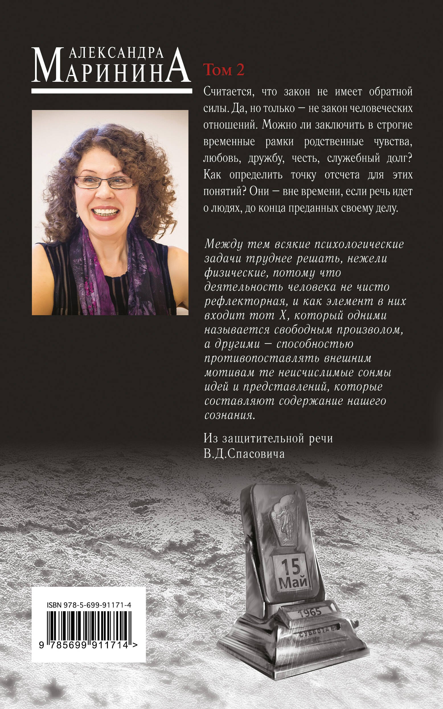 Особенности: Это глубокий, детально проработанный и такой долгожданный роман, над которым Александра Маринина работала несколько лет. Материал для него автор собирала в музеях разных городов России, анализируя архивные данные и исторические документы, тщательно исследуя историю юриспруденции в Российской империи. Здесь напряженная, захватывающая история одной семьи соединяется с переломными моментами в жизни страны. Как менялись законы, как влияли исторические обстоятельства на судьбы этих людей, как они хранили семейные тайны и чтили традиции, как жили, любили, чувствовали себя на этом временном отрезке жизни – обо всем этом и не только в новом, потрясающем, сильном и завораживающем романе знаменитой писательницы!