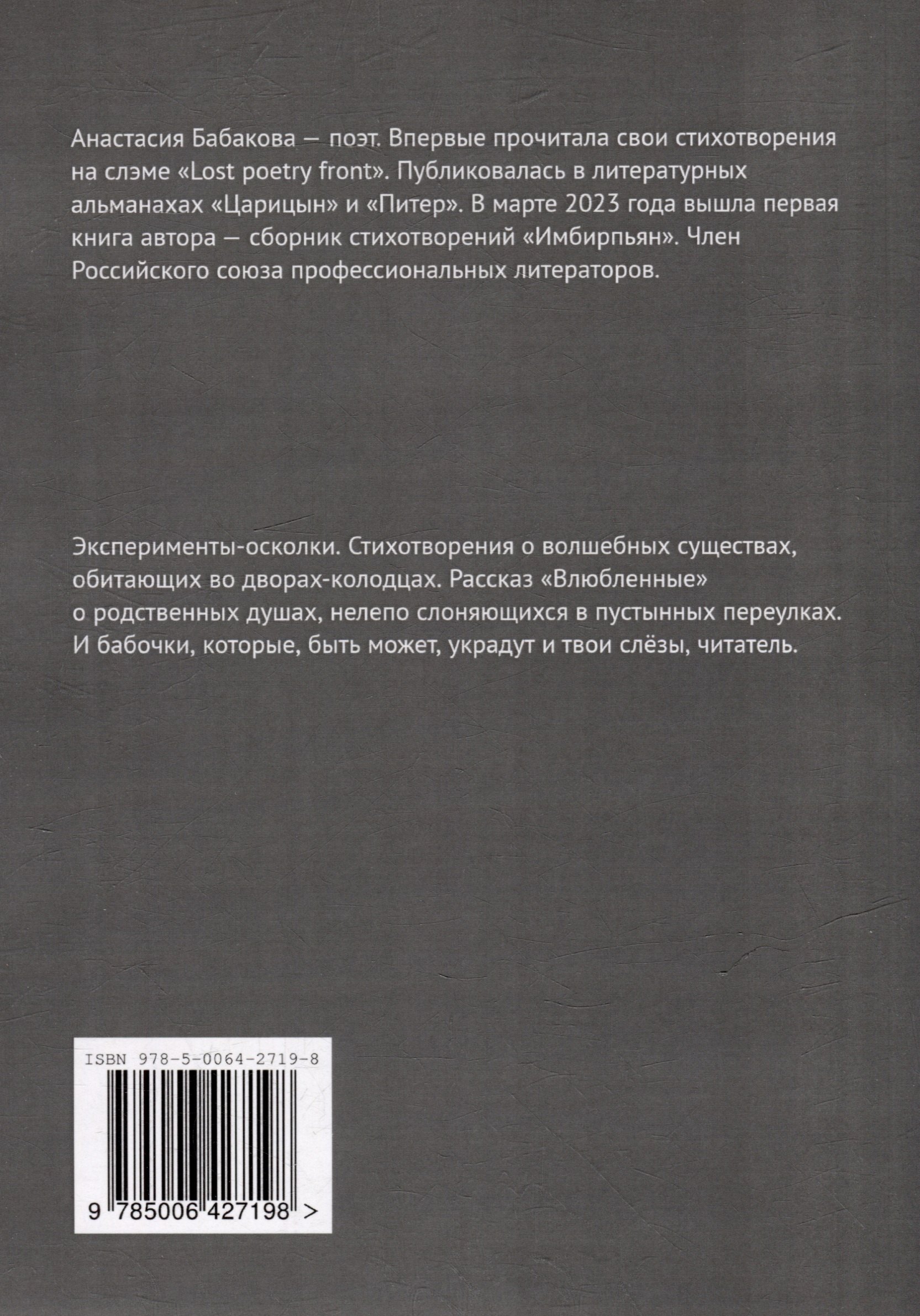 Эксперименты-осколки. Стихотворения о волшебных существах, обитающих во дворах-колодцах. Рассказ «Влюбленные» о родственных душах, нелепо слоняющихся в пустынных переулках. И бабочки, которые, быть может, украдут и твои слёзы, читатель.