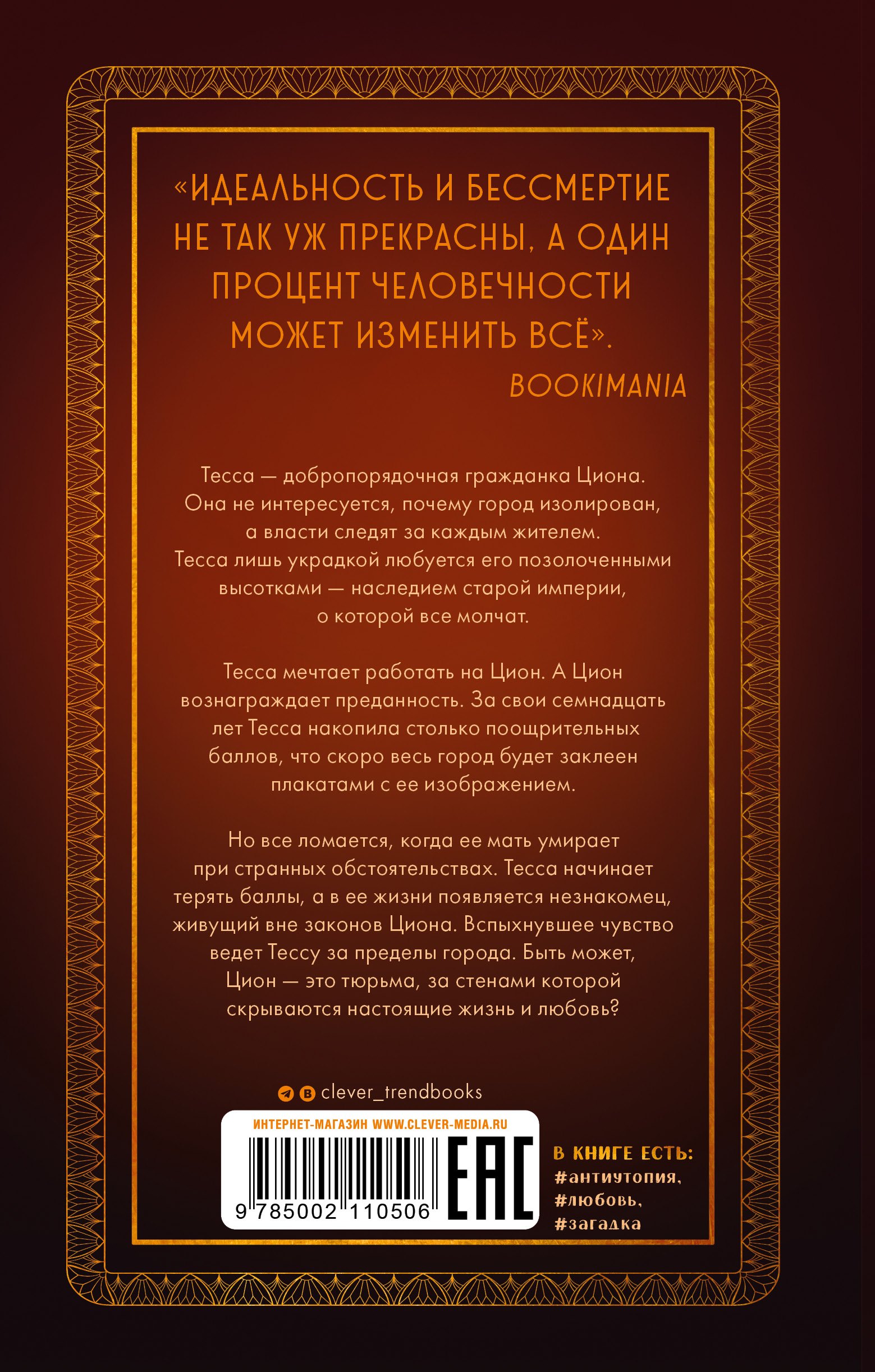 Но все ломается, когда ее мать умирает при странных обстоятельствах. Тесса начинает терять баллы, а в ее жизни появляется незнакомец, живущий вне законов Циона. Вспыхнувшее чувство ведет Тессу за пределы города. Быть может, Цион — это тюрьма, за стенами которой скрываются настоящие жизнь и любовь?