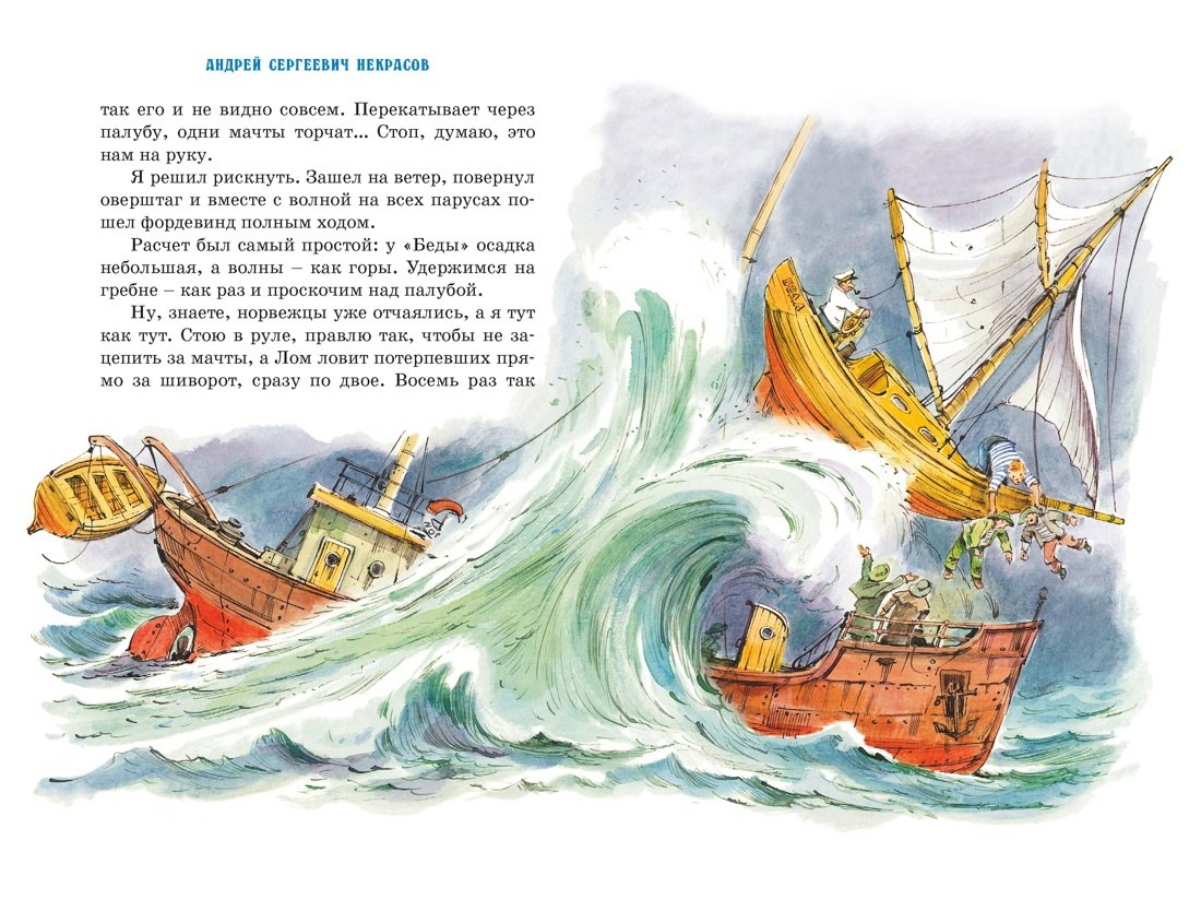 Первый раз я прочитал эту повесть еще в ранней юности. Книга, как говорится, запала. Она рассказывает о фантастическом кругосветном путешествии капитана Врунгеля и его маленькой команды в составе помощника Лома и матроса Фукса на яхте "Беда". Конечно это произведение предназначено в первую очередь для подрастающего поколения, но и взрослым людям (мне так думается) будет приятно почитать эту повесть и хоть немного отвлечься от ежедневных проблем. По мотивам данного произведения снят одноименный мультфильм. Стоит отметить, что книжный сюжет несколько расходится с сюжетом мультфильма. Ясный сюжет и очень симпатичные персонажи – вот что отличает это произведение среди прочих. Автор взял за основу морской роман и привнес в него спортивную составляющую – регату. Но это лишь преамбула, на первом плане в этой истории стоит симпатичный и неунывающий капитан Врунгель, с потрясающим стоицизмом воспринимающий испытания судьбы. Врунгель – прекрасный персонаж, личность на которую стоит ровняться. При этом капитан не идеален, есть и у него свои заскоки, что придает ему правдоподобности. Поражает его жизнелюбие, подход к любому делу и смелость. Не оставило равнодушным- изворотливость ума и смекалка капитана. Посмотришь на него, да и не поверишь, что он хоть раз в жизни видел воду, держал штурвал. Ну а что, внешность же не главное, опыт важен и хорошая команда, а если таковая найдется, то и «Беда» не беда, поплывет.