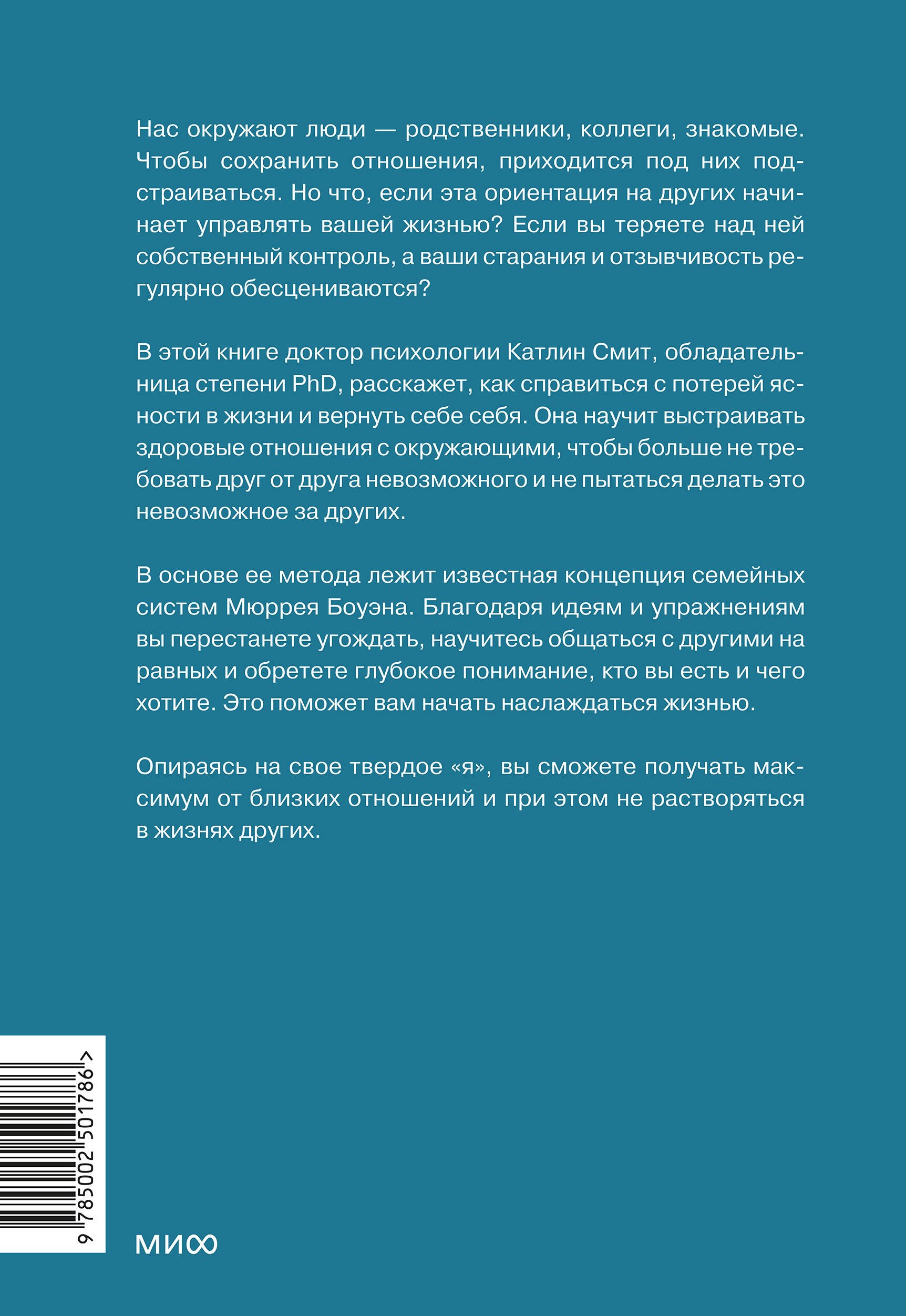 Доктор психологии Катлин Смит написала руководство, как отказаться от навязанных убеждений и ожиданий других, общаться с людьми на равных, не растворяясь в их жизнях, обрести глубокое понимание своих истинных желаний и ценностей. База — концепция семейных систем Мюррея Боуэна, основанной на эволюционном подходе к пониманию работы мозга и социальности.