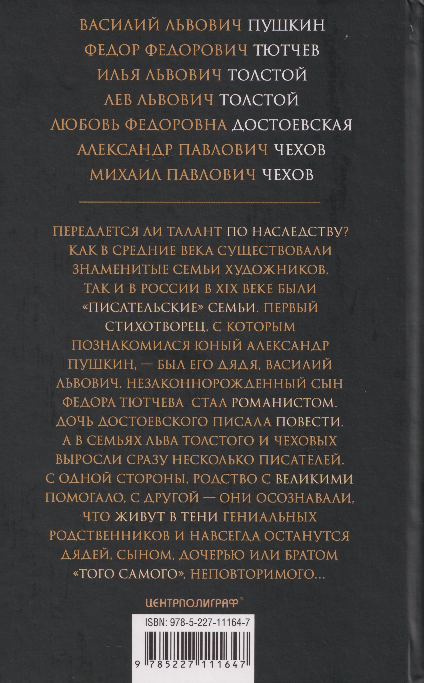 Неизвестно, передается ли талант поэта или писателя по наследству, но как в Средние века существовали знаменитые семьи художников или композиторов, где сын наследовал ремесло отца, так и в России в XIX веке было несколько «писательских» семей. Первый стихотворец, с которым познакомился юный Александр Сергеевич Пушкин, это его дядя, Василий Львович. Незаконнорожденный сын Федора Ивановича Тютчева и его возлюбленной, Елены Александровны Денисьевой, стал романистом. Дочь Достоевского Любовь писала повести. А в семьях Льва Толстого и Чеховых выросли сразу несколько писателей. С одной стороны, родство с великими помогало они знали и видели, как создаются литературные произведения и то, что это требует немалого труда. С другой стороны, они не могли не сознавать, что живут в тени гениальных родственников, что навсегда останутся дядей, сыном, дочерью или братом «того самого», неповторимого... Тем не менее их судьбы и книги интересны и достойны того, чтобы о них рассказали. Произведения авторов, о которых идет речь в этой книге, это живые документы эпохи, которых не тронул официальный глянец и которые не успели «забронзоветь». Они написаны простыми людьми, похожими на нас. И если эти истории вызвали у вас интерес, значит, русская литература не ограничивается теми именами, которые мы находим в школьном учебнике.
