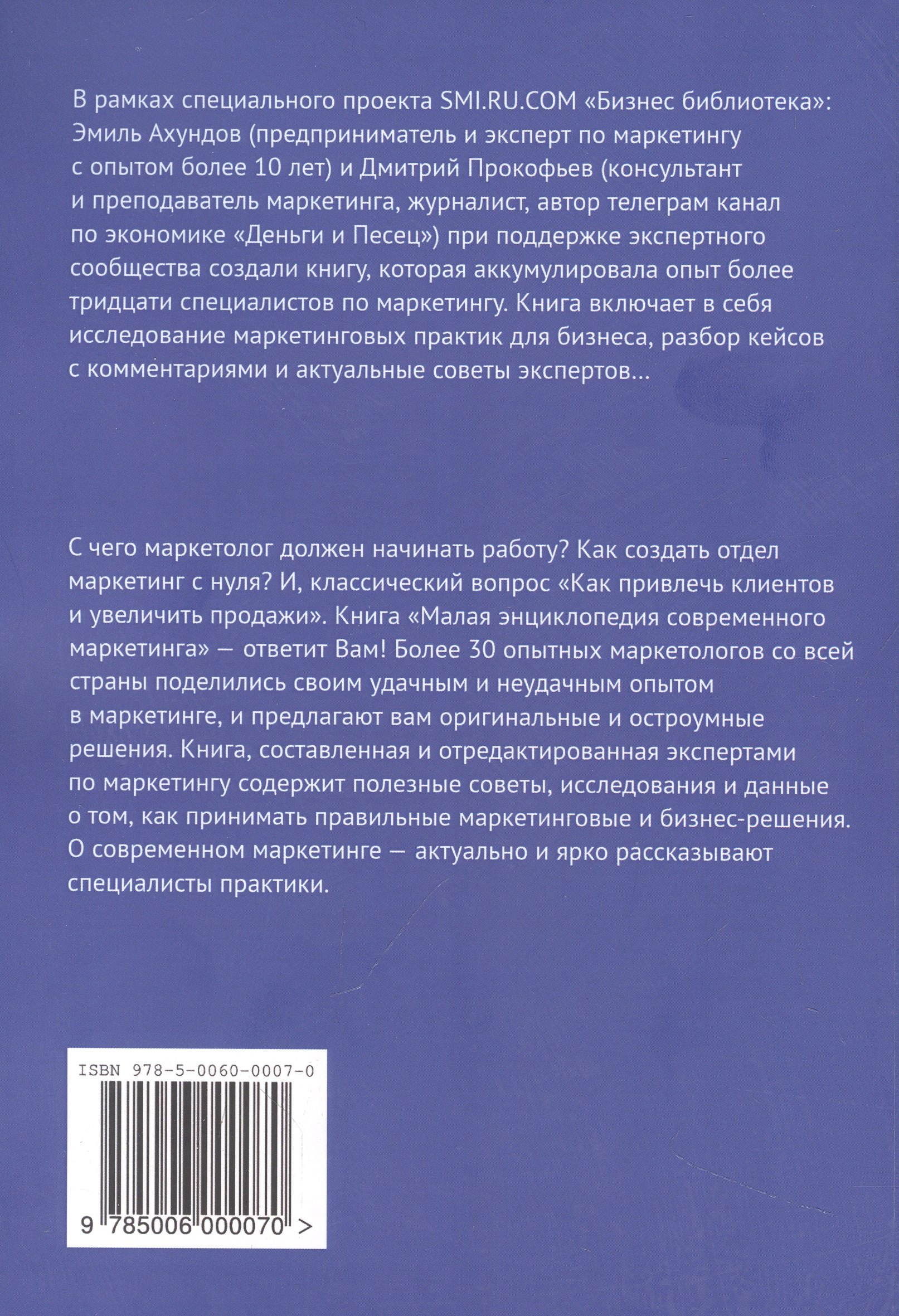 Хотите узнать, как привлечь новых клиентов и увеличить продажи? Тогда книга «Малая энциклопедия современного маркетинга» — это то, что вам нужно! Более 30 опытных маркетологов со всей страны поделились своим удачным и неудачным опытом в маркетинге, чтобы помочь вам достичь успеха. Эта книга содержит полезные советы, исследования и данные о том, как принимать правильные маркетинговые и бизнес решения. Не упустите свой шанс узнать все о современном маркетинге от специалистов в своей отрасли.