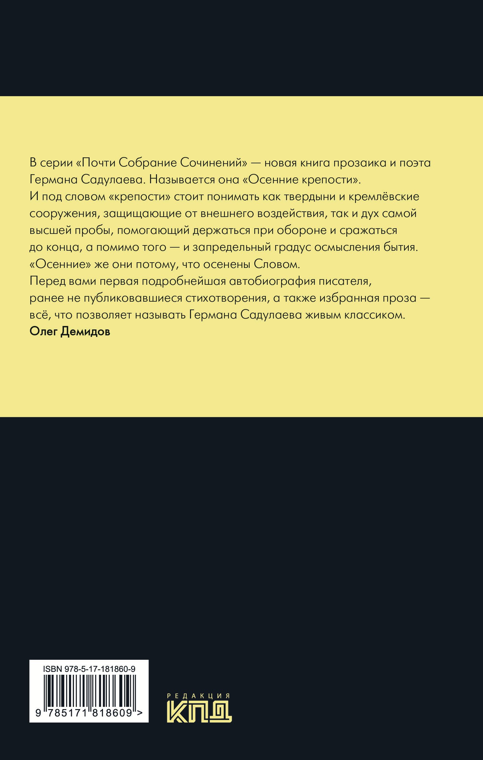 В серии "Почти Собрание Сочинений" — новая книга прозаика и поэта Германа Садулаева. Называется она "Осенние крепости". И под словом "крепости" стоит понимать как твердыни и кремлёвские сооружения, защищающие от внешнего воздействия, так и дух самой высшей пробы, помогающий держаться при обороне и сражаться до конца, а помимо того — и запредельный градус осмысления бытия. "Осенние" же они потому, что осенены Словом. Перед вами первая подробнейшая автобиография писателя, ранее не публи-