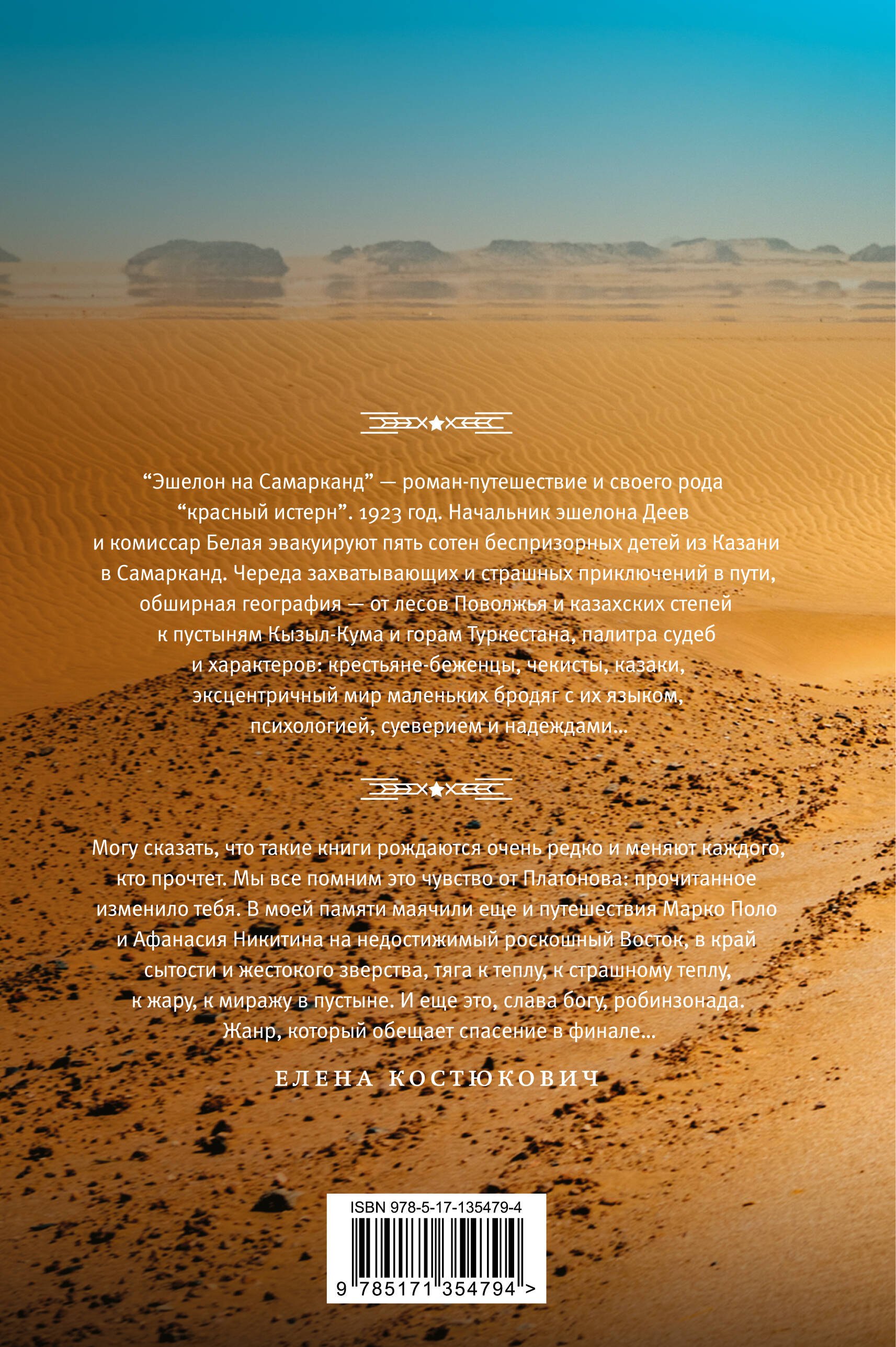Ее новая книга «Эшелон на Самарканд» — роман-путешествие и своего рода «красный истерн». 1923 год. Начальник эшелона Деев и комиссар Белая эвакуируют пять сотен беспризорных детей из Казани в Самарканд. Череда захватывающих и страшных приключений в пути, обширная география — от лесов Поволжья и казахских степей к пустыням Кызыл-Кума и горам Туркестана, палитра судеб и характеров: крестьяне-беженцы, чекисты, казаки, эксцентричный мир маленьких бродяг с их языком, психологией, суеверием и надеждами…
