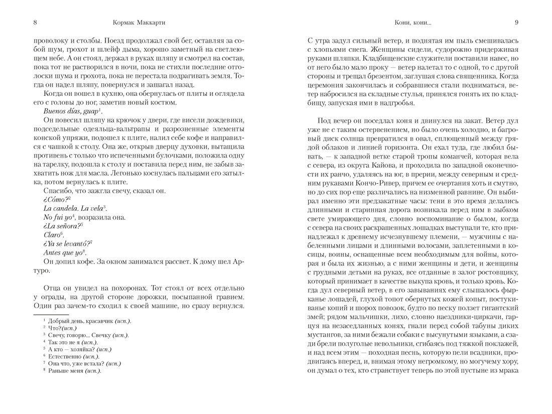 Великолепная книга. Для тех, кто не ищет спешки в сюжетах. Для тех, кто готов вечерами с кружками чая, проводить по паре часов в спокойной обстановке. Роман о жизни людей, у которых жизнь, вроде, идет своим чередом, но какие-то события, порывы вносят в их жизнь динамику. При этом сюжет не впрыскивает дозы адреналина в кровь читающего, заставляя читателя лихорадочно читать предложения и 200% собственного внимание сконцентрировать на книге. Здесь, наоборот, вместе с сюжетом читатель изучает испанский, любуется хорошо прорисованными ландшафтами приграничных регионов обоих государств (США, Мексики), пробует мексиканские блюда, учиться различать породы лошадей и их особенности. В книге великолепные предложения - не зря она уже стала классикой. В книге есть мудрость - отсылка к учениям Г.Гурджиева (надо почитать) и философии гностицизма. Что надо тоже почитать. По завершению последнего роман трилогии остается послевкусие размышлений . Ну например: 1. Если у тебя очень яркая жизнь, пока ты молодой, то либо ты закончишь свою жизнь молодым или ты умрешь бомжом на теплотрассе. Какую жизнь ты хочешь провести? 2. Если начинаешь дело, то к тебе может кто-то легко примкнуть и потом внезапно отойти от дела. Нужно просто смириться и принять данное. Не стоит рефлексировать. 3. Если хочешь достичь недостижимой цели, то будь готов, что жизнь из-за этого можно и потерять. Если вам нужны зрелища, экшн, то из более 1000 страниц текста, здесь он всего лишь примерно на нескольких страницах. Думаю, что вам тогда лучше взять другую книгу. Вам здесь будет скучно. Тем, кто любит атмосферность, пейзажи, размеренность и просто классные предложения - эта книга ваша. Рекомендую