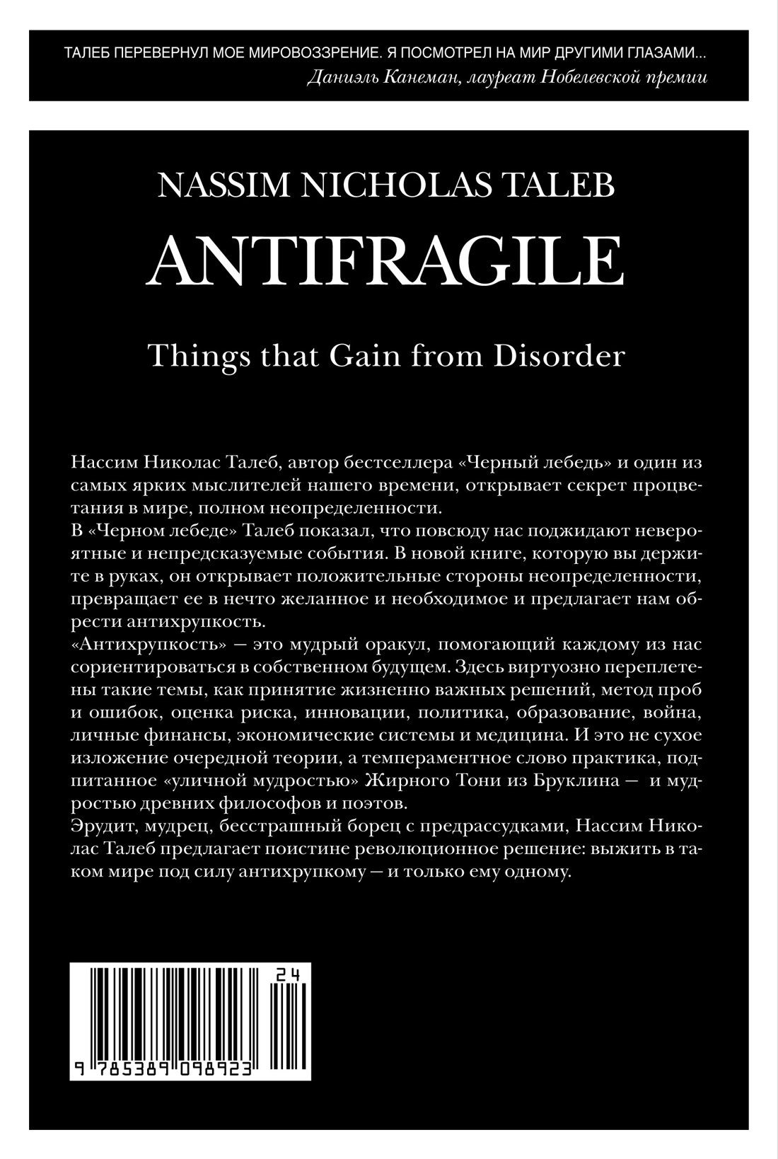 «Антихрупкость» – книга уникальная: она рассказывает о ключевом свойстве людей, систем и не только, свойстве, у которого до сих пор не было названия. В мире, где царит неопределенность, нельзя желать большего, чем быть антихрупким, то есть уметь при столкновении с хаосом жизни не просто оставаться невредимым, но и становиться лучше прежнего, эволюционировать, развиваться. Талеб формулирует простые правила, которые позволяют нам преодолеть хрупкость и действовать так, чтобы непредсказуемая неопределенность, этот грозный и внезапный Черный лебедь, не причинила нам вреда – и более того, чтобы эта редкая и сильная птица помогла нам совершенствоваться. Для этого следует в первую очередь осознать: мы по природе своей антихрупки – и не должны позволять кому бы то ни было лишать нас этого чудесного свойства.
