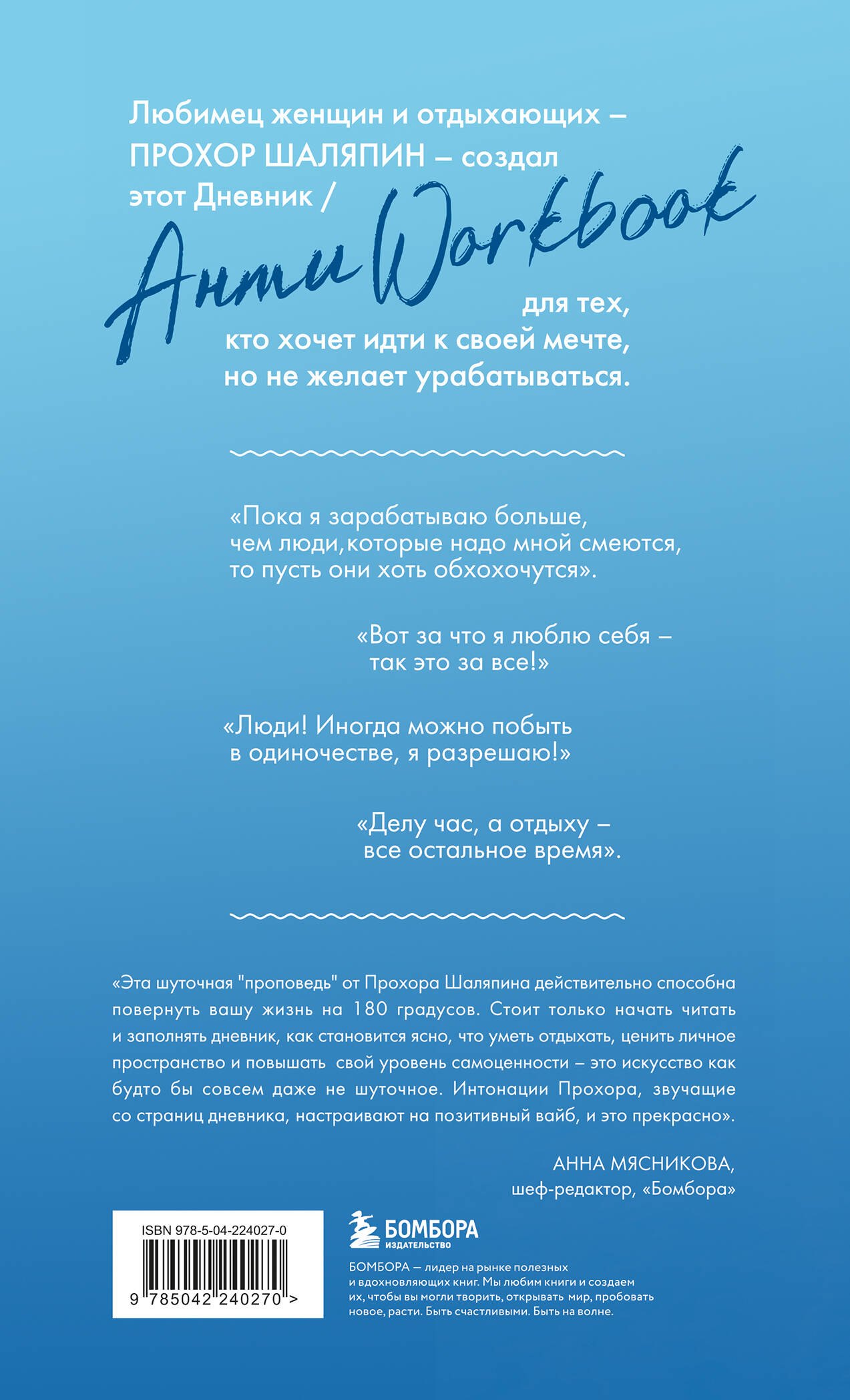 «Эта шуточная "проповедь" от Прохора Шаляпина действительно способна повернуть вашу жизнь на 180 градусов. Стоит только начать читать и заполнять дневник, как становится ясно, что уметь отдыхать, ценить личное пространство и повышать свой уровень самоценности — это искусство как будто бы совсем даже не шуточное. Интонации Прохора, звучащие со страниц дневника, настраивают на позитивный вайб, и это прекрасно». — Анна Мясникова, шеф-редактор, Бомбора